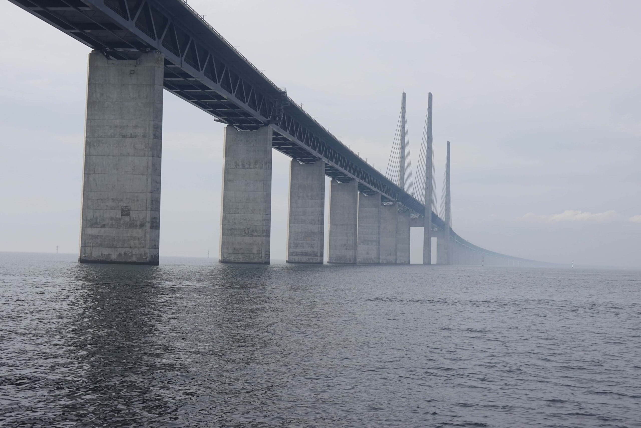 De flesta andra går för motor, t ex denna vackra danska skuta. Väldigt lik skutan Anna-Sofia, fast den har ju två master. Fast vad säger du Anna Grahn, visst är de rätt lika varandra i övrigt?Men, vad är då detta? Seglar gör de i alla fall. I alla fall har de segel uppe. Det skulle kunna vara ett segelfartyg som heter Amphitrite, ett av världens äldsta segelfartyg, i alla fall som fortfarande seglar. Hon är byggd i Storbritannien 1884-87 och seglar under tysk flagg.Öresundsbron försvinner in i ett töcken. Man såg att det var strömt runt brofundamenten. Hade vi tillräcklig fart eller skulle vi med rådande vindvinkel driva ner mot fundamentet? Men, vi klarade oss utan att behöva stötta med motor eller slå.Plötsligen hände något med himlen, begynnande blått istället för grått och skepparen ser ju inte missnöjd ut över denna förändring. Foto: Louise.
