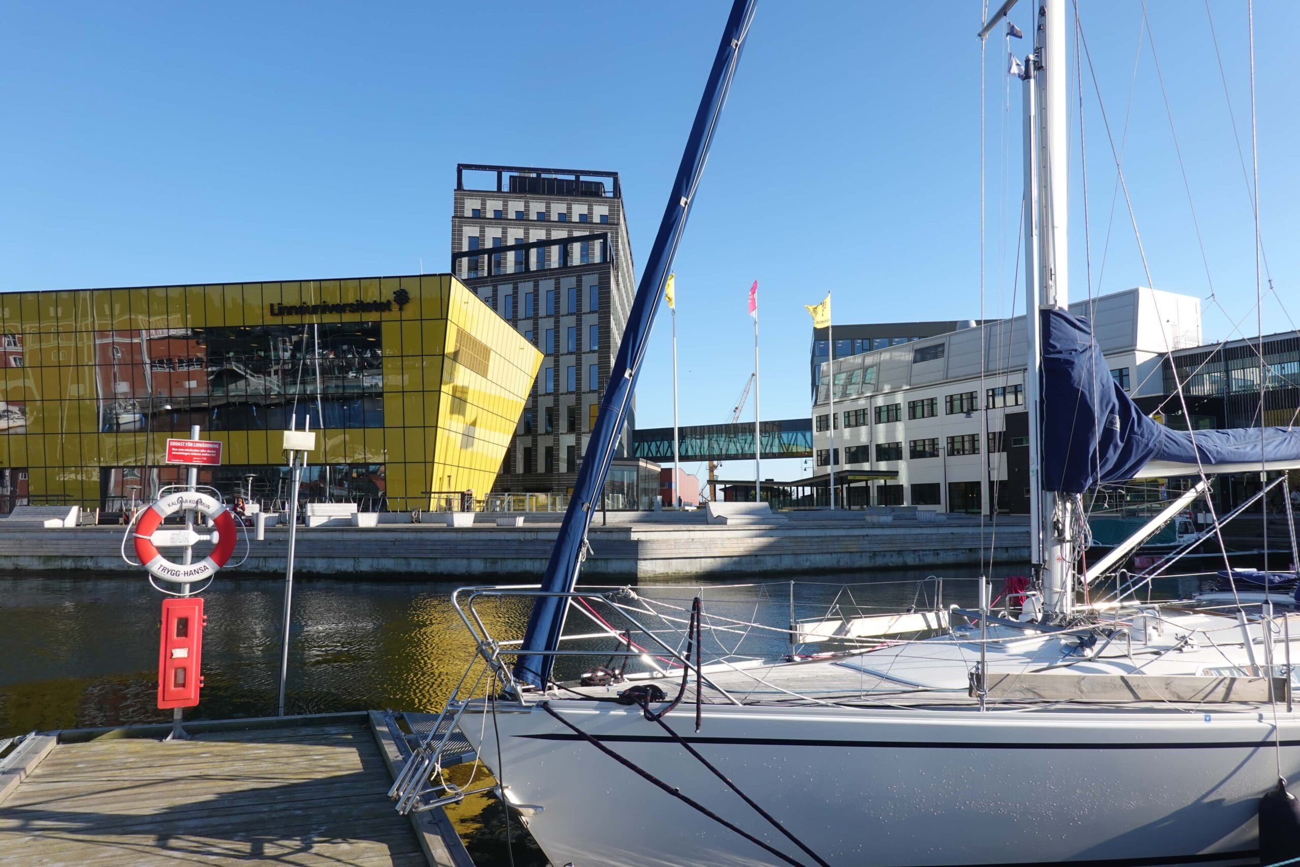 Här i Västra hamnen huserade tidigare Kockums varv och en del oljedepåer. Västra hamnen idag är ett bostadsområde uppblandat med företag och Malmö universitet. Landmärket är tvivelsutan, Turning Torso. Jag skulle inte vilja bo i Turning Torso, men visst är det en läcker byggnad. Det mesta av Västra hamnen i övrigt känns däremot inte lika läckert, om du skulle fråga mig. Det är betong, det känns sterilt, en del kvarter ser fortfarande ut som rivningstomter, det sticker upp en hel del ogräs och parkanläggningarna tycks inte skötas något vidare. Detta trots att Malmö brukar kallas för Parkernas stad. Överhuvudtaget ser det redan lite slitet ut, trots att startskottet för den moderna bebyggelsen avlossades så sent som i samband med bomässan Bo01, år 2001.Men, så finns det några kvarter med vad som kan liknas vid moderna Town houses och gnälliga gubben gnäller inte lika mycket längre. Inte så tokigt. Och som jag beskrev det i mitt förra inlägg, kommer man sedan ner till Sundspromenaden och Turbinhamnen, där jag låg med Aquileja, upphör gnället helt. Där är det väldigt trevligt att flanera eller ligga med båt.