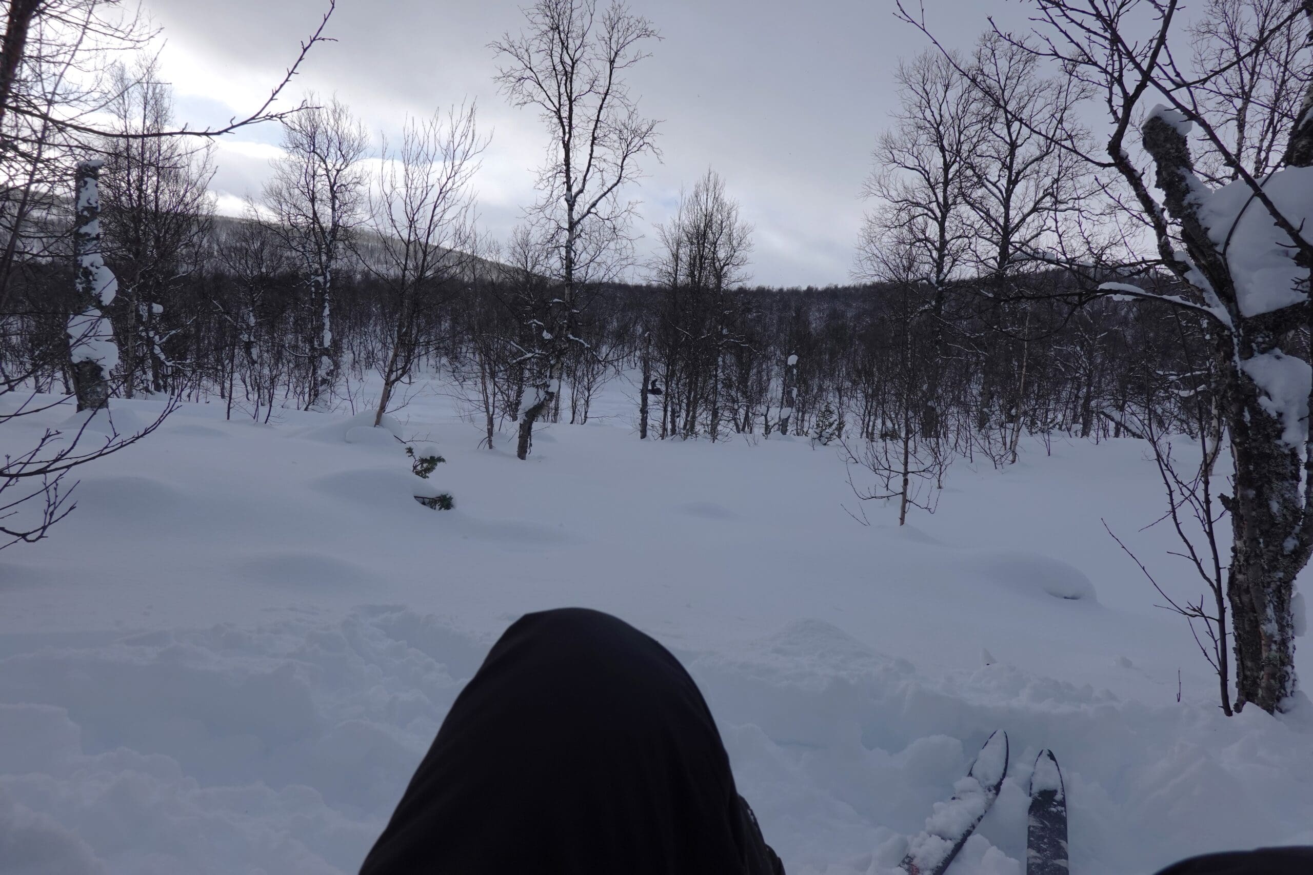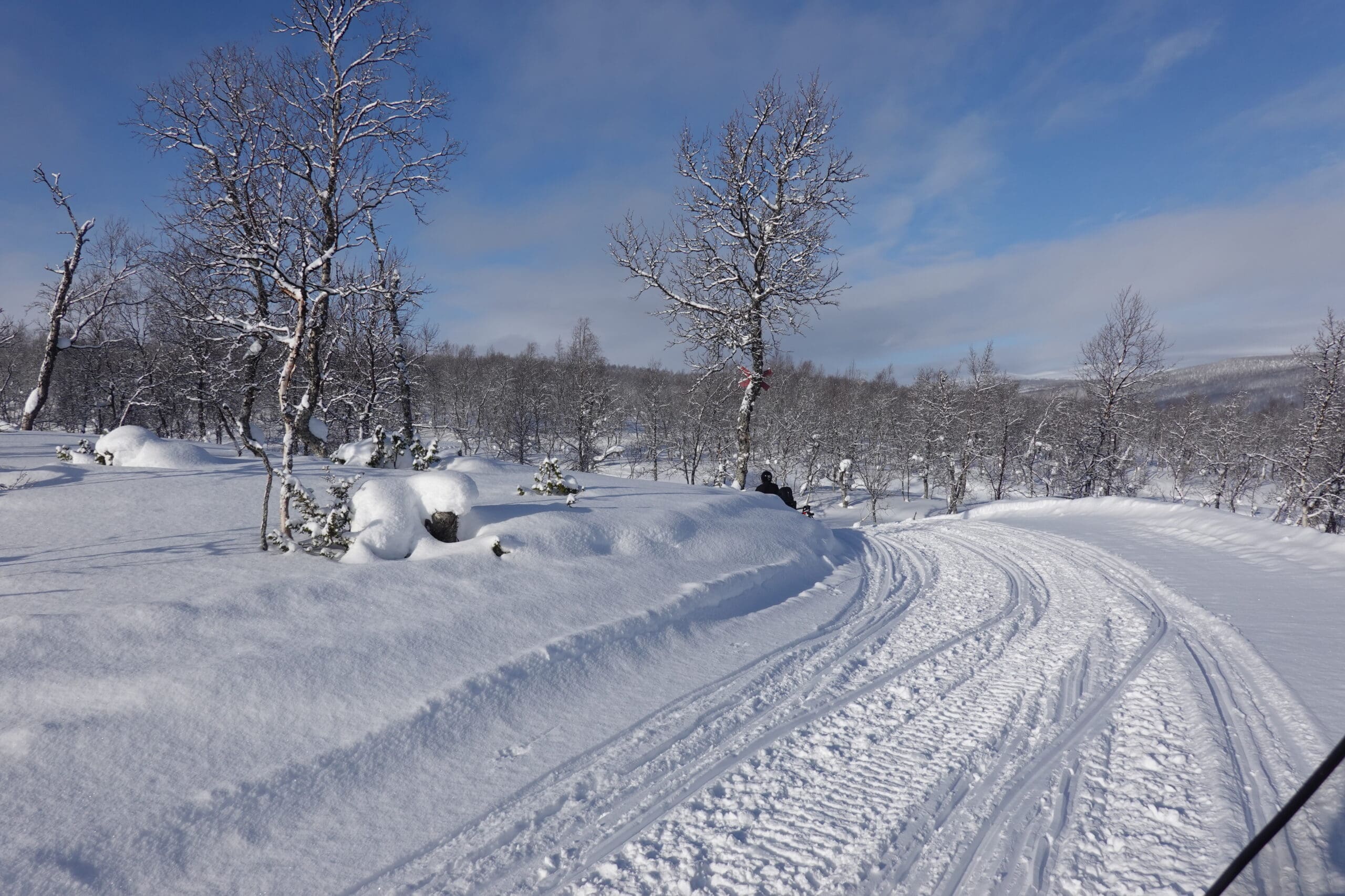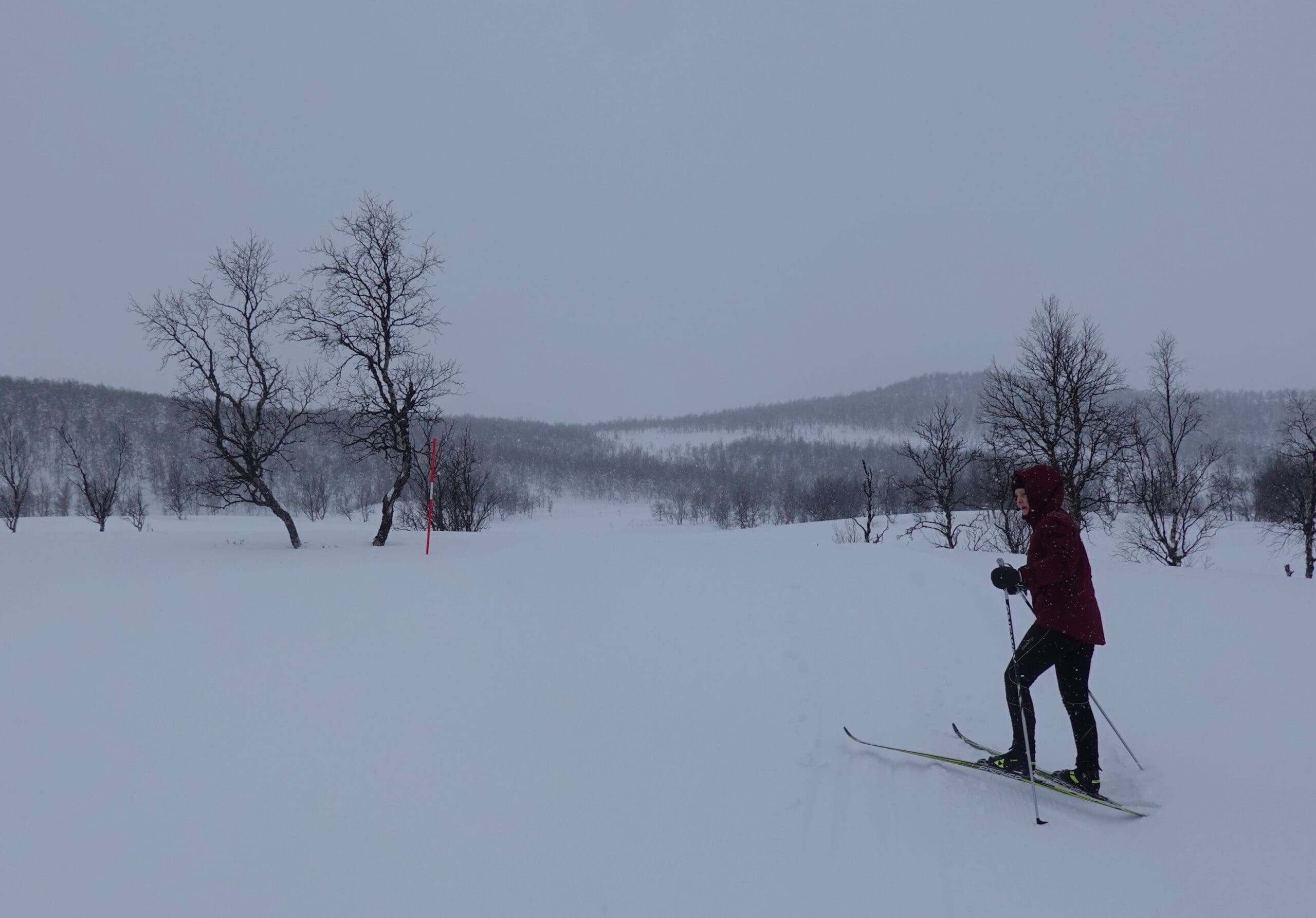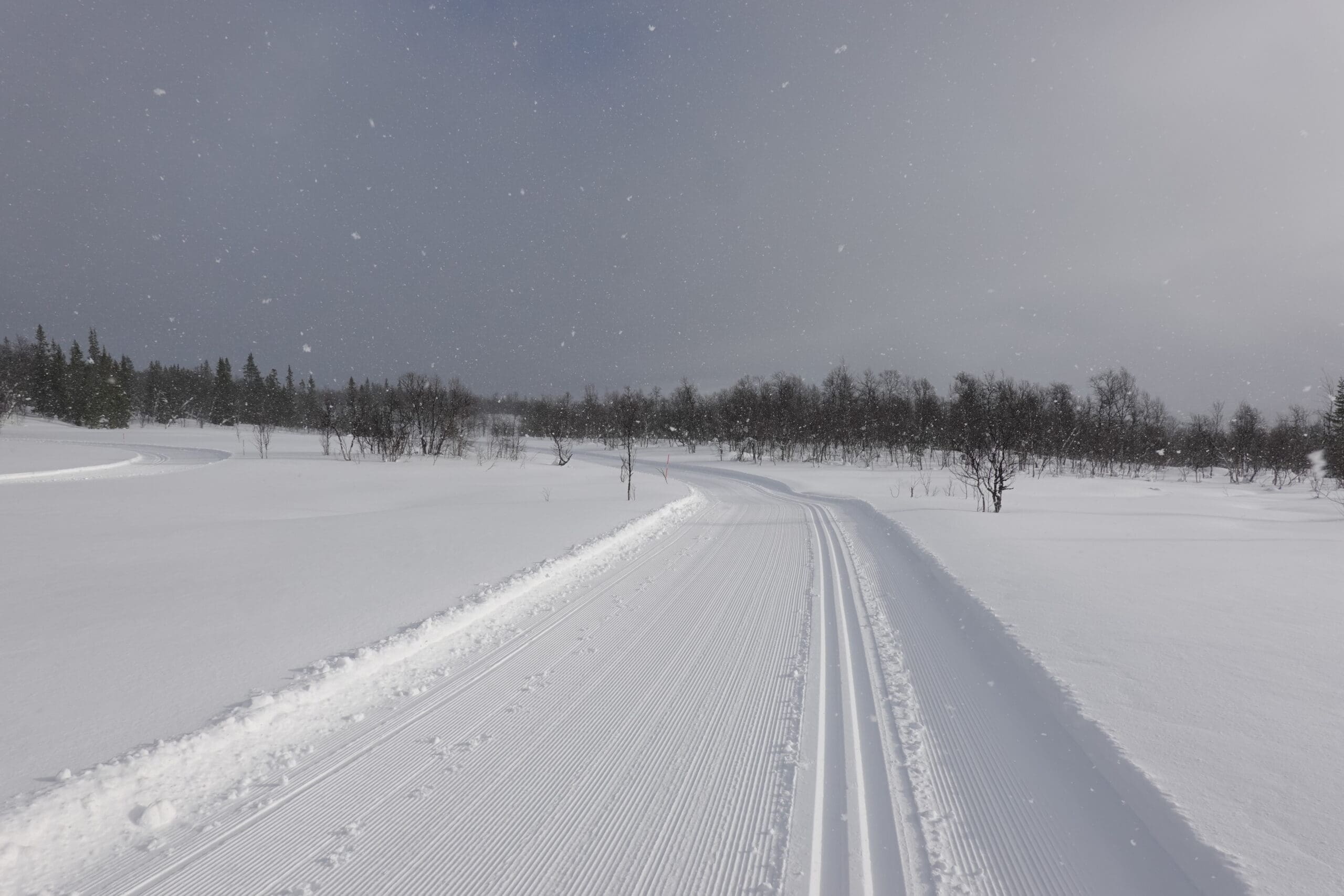 Måndag var ingen optimal dag för längdåkning. Det hade snöat mycket och spåren gick knappt att finna, så den där pirrande känslan av att åka på nya skidor infann sig inte riktigt. – Var det inte en turskida du hade köpt?, kanske vän av ordning invänder. Så sant, men allt är kompromisser och den här skidan är inte jättebred, utan precis så bred att den även ska få plats i preparerade spår. Det var ändå inte läge att ge sig ut på fjället, djup och lös snö så fort man hamnade utanför det icke-existerande spåret. Krokiga fjällbjörkar en bit ut i terrängen erbjöd förvisso bra sittplatser för fikapausen, men skidorna fick man se till att behålla på sig, annars hade man nog inte sett röken av dem mer. Och vad hade hänt om vi lämnat skidorna i spåret och pulsat fram till den utvalda fikaplatsen? Drunknat?