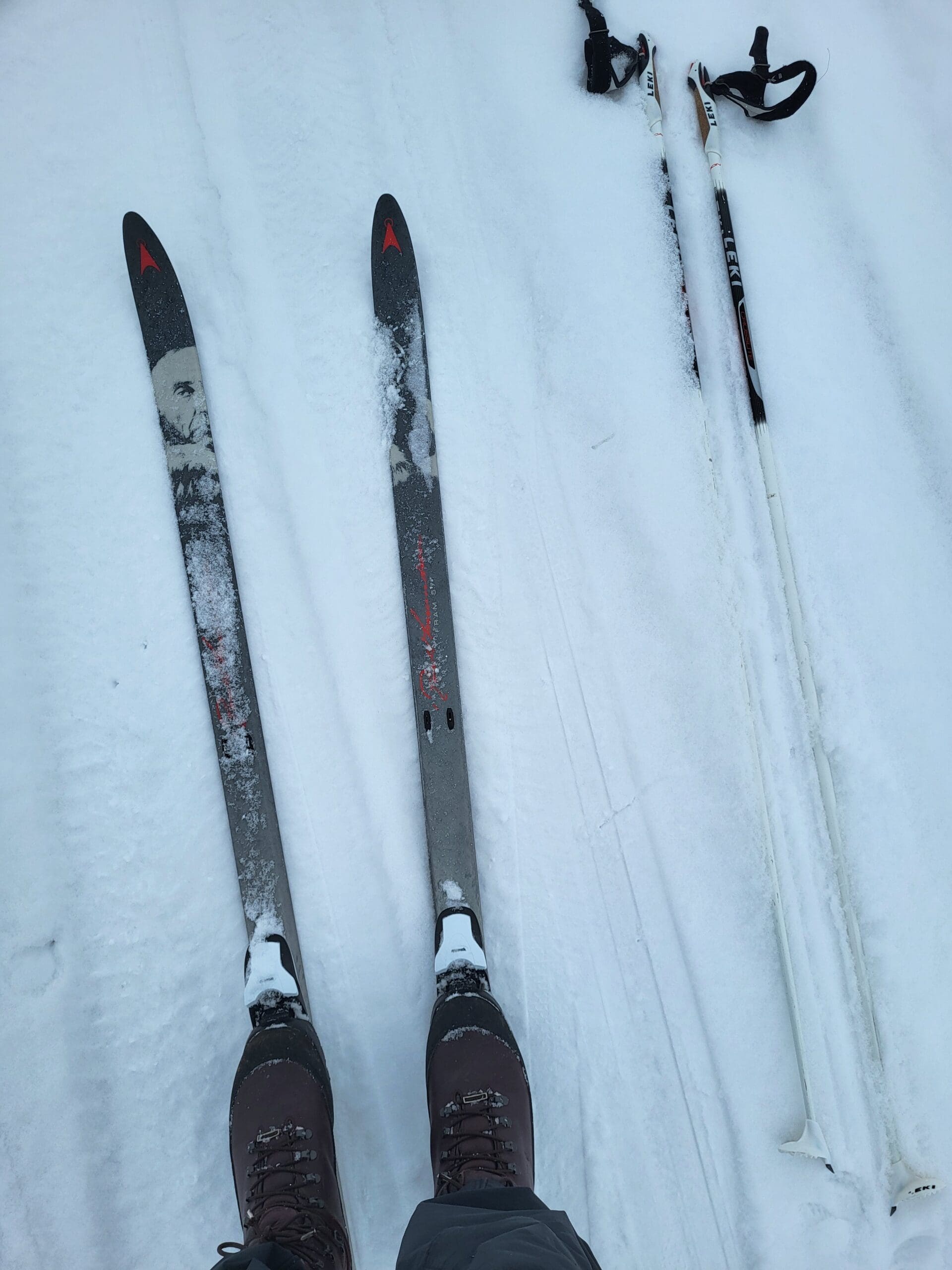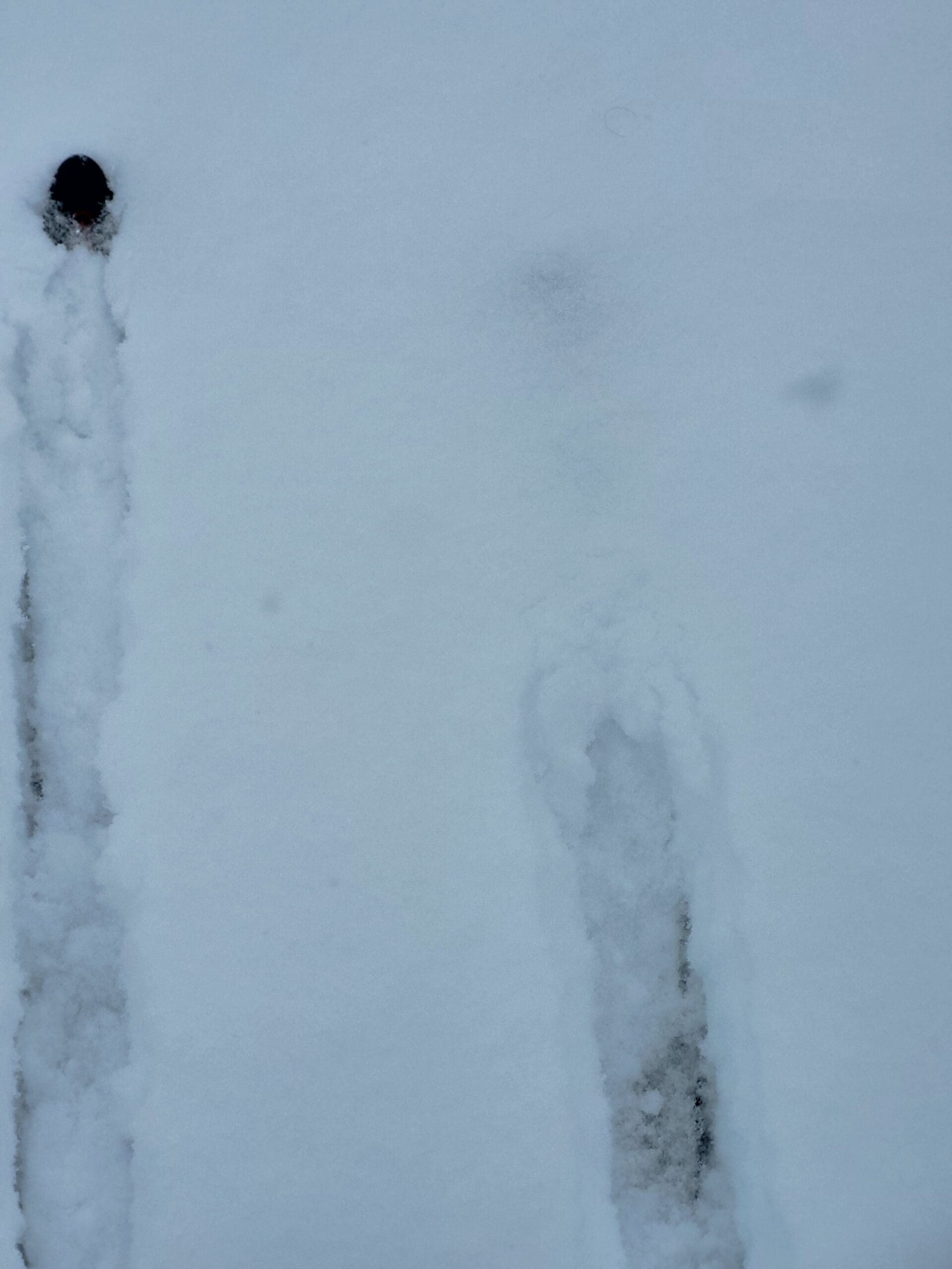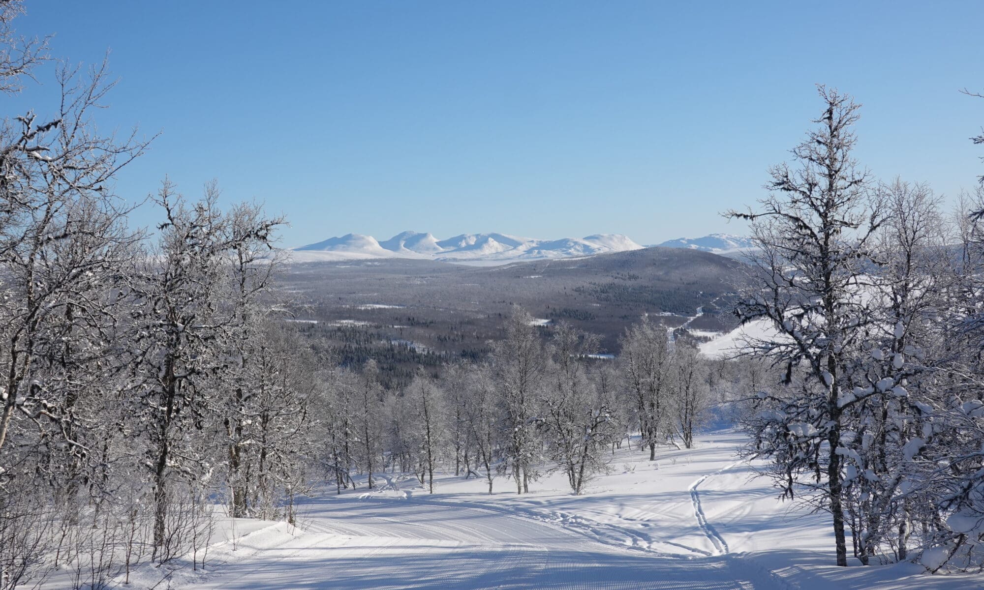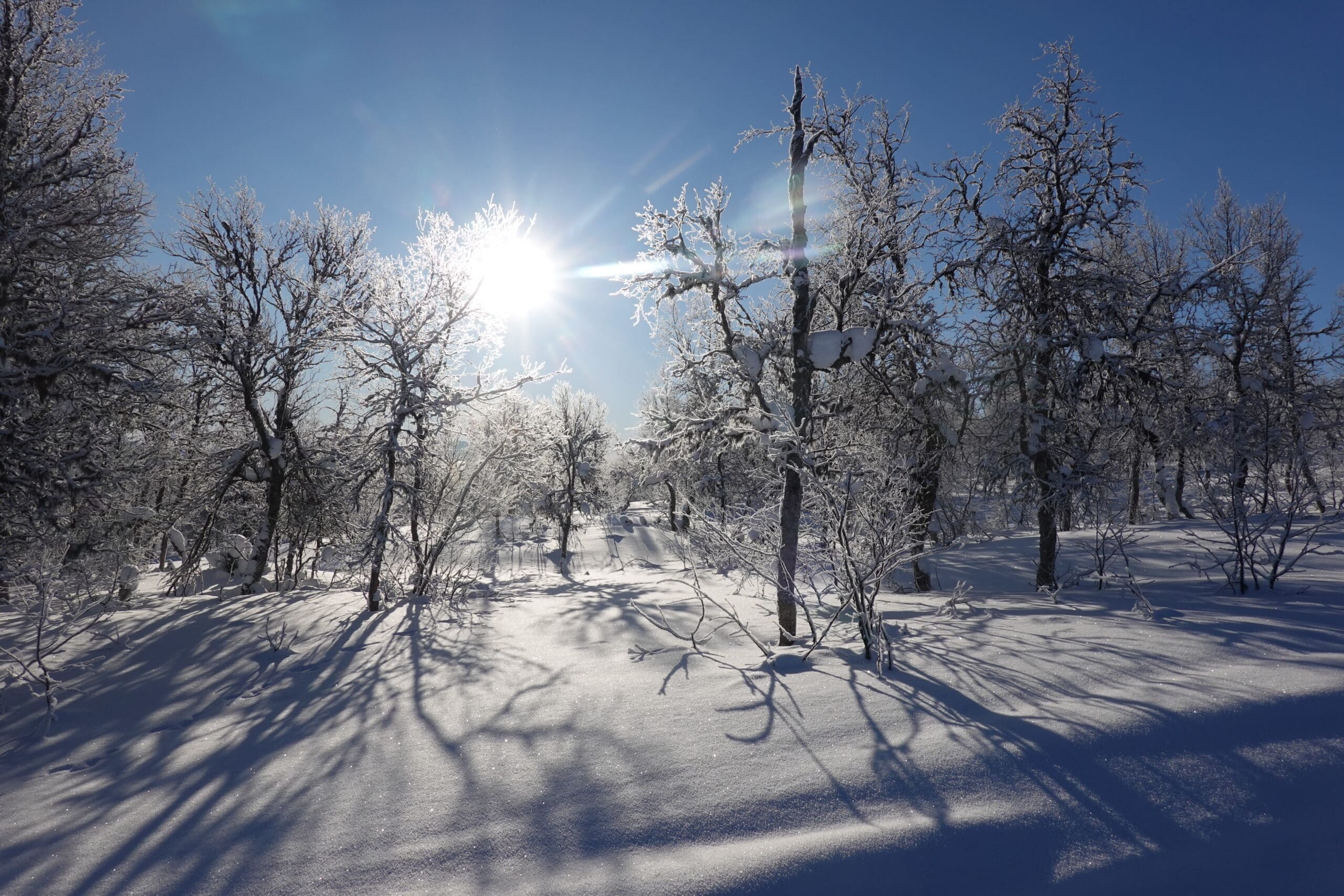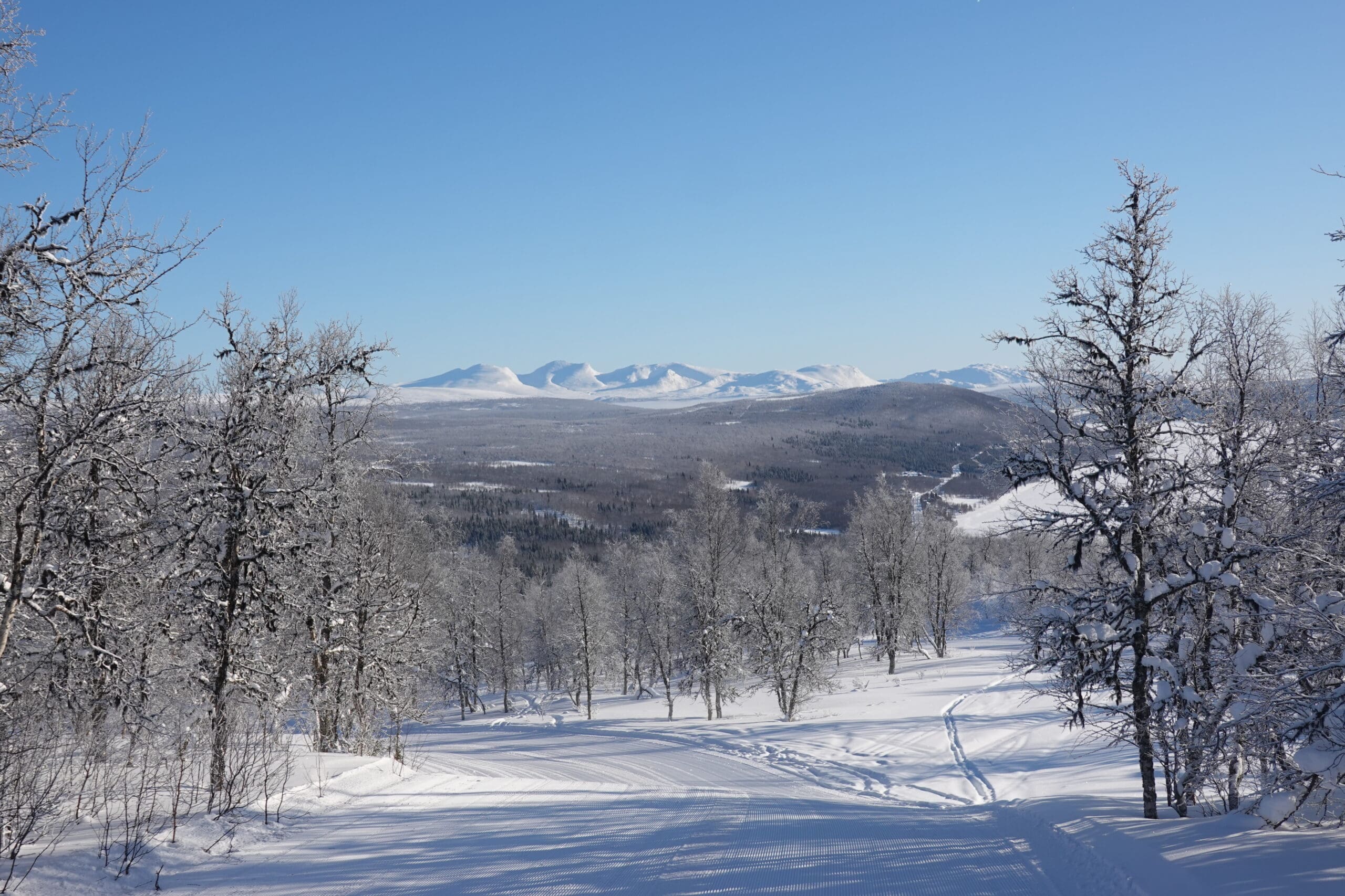Måndag var ingen optimal dag för längdåkning. Det hade snöat mycket och spåren gick knappt att finna, så den där pirrande känslan av att åka på nya skidor infann sig inte riktigt. – Var det inte en turskida du hade köpt?, kanske vän av ordning invänder. Så sant, men allt är kompromisser och den här skidan är inte jättebred, utan precis så bred att den även ska få plats i preparerade spår. Det var ändå inte läge att ge sig ut på fjället, djup och lös snö så fort man hamnade utanför det icke-existerande spåret. Krokiga fjällbjörkar en bit ut i terrängen erbjöd förvisso bra sittplatser för fikapausen, men skidorna fick man se till att behålla på sig, annars hade man nog inte sett röken av dem mer. Och vad hade hänt om vi lämnat skidorna i spåret och pulsat fram till den utvalda fikaplatsen? Drunknat?