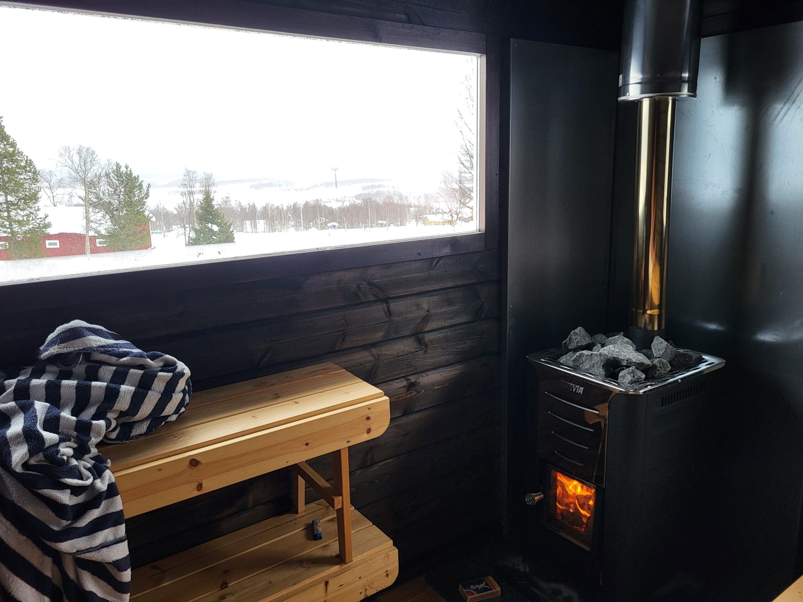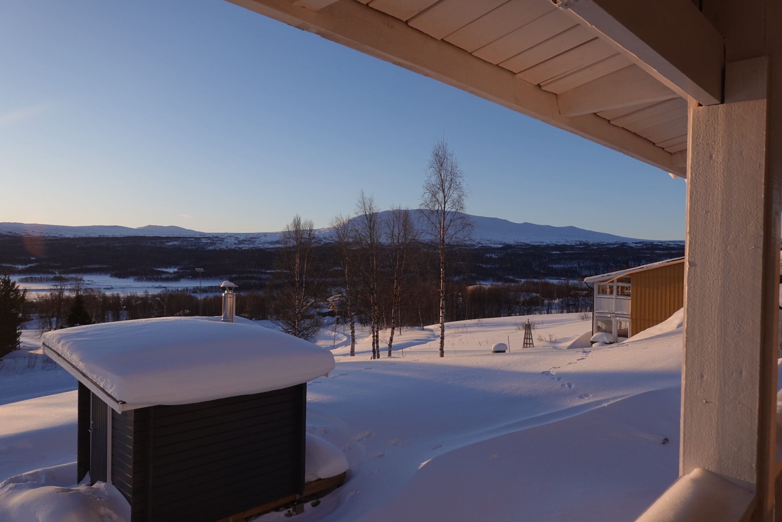 Ingen dålig belöning av att kliva upp tidigt. Nedanför syns även den nybyggda bastun, så ny att vi skull få äran att inviga den. Förut hade man lånat grannens bastu, men nu ville de ha sin bastu för sig själva, så familjen fick bygga en egen. Först gällde det bara att skotta en gångväg fram till bastun och ladda med ved.