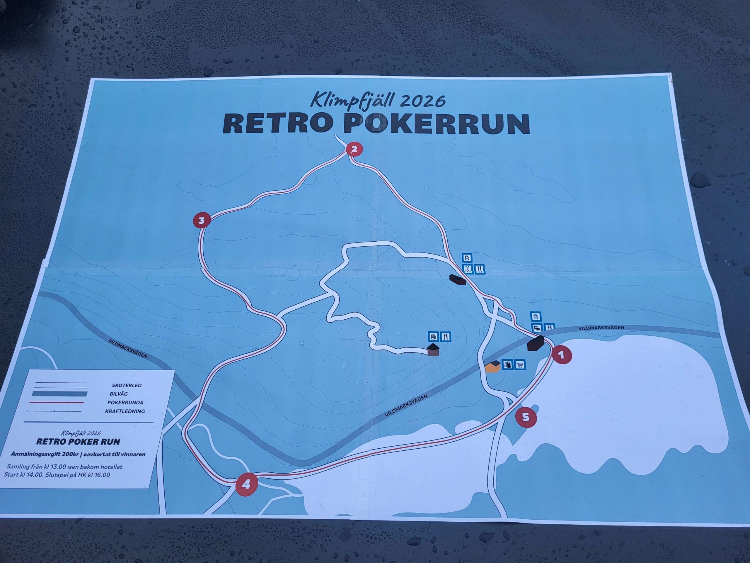 Per skoter skulle man ta sig runt en bana och få ett förseglat kuvert vid fem olika kontrollstationer. Spelkorten i kuverten skulle bli ens pokerhand för den avslutande pokerrundan på hotellet.
