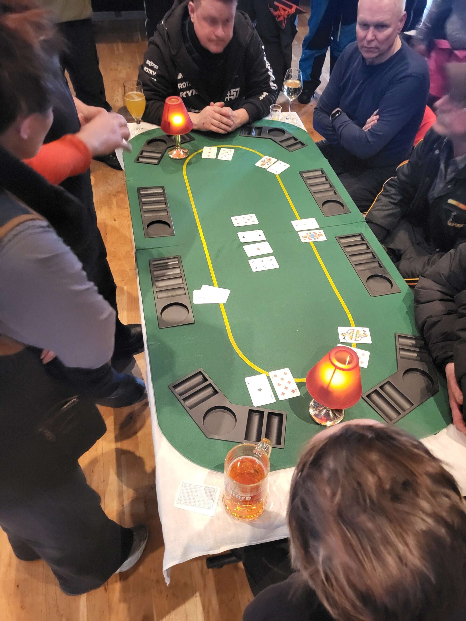 Mina kuvert gav mig en hand med par i tior. Ingen vinnande hand med andra ord. De med de fem bästa händerna fick delta i ett slutspel. Vinnaren kammade hem alla anmälningsavgifter, 5000 kr.