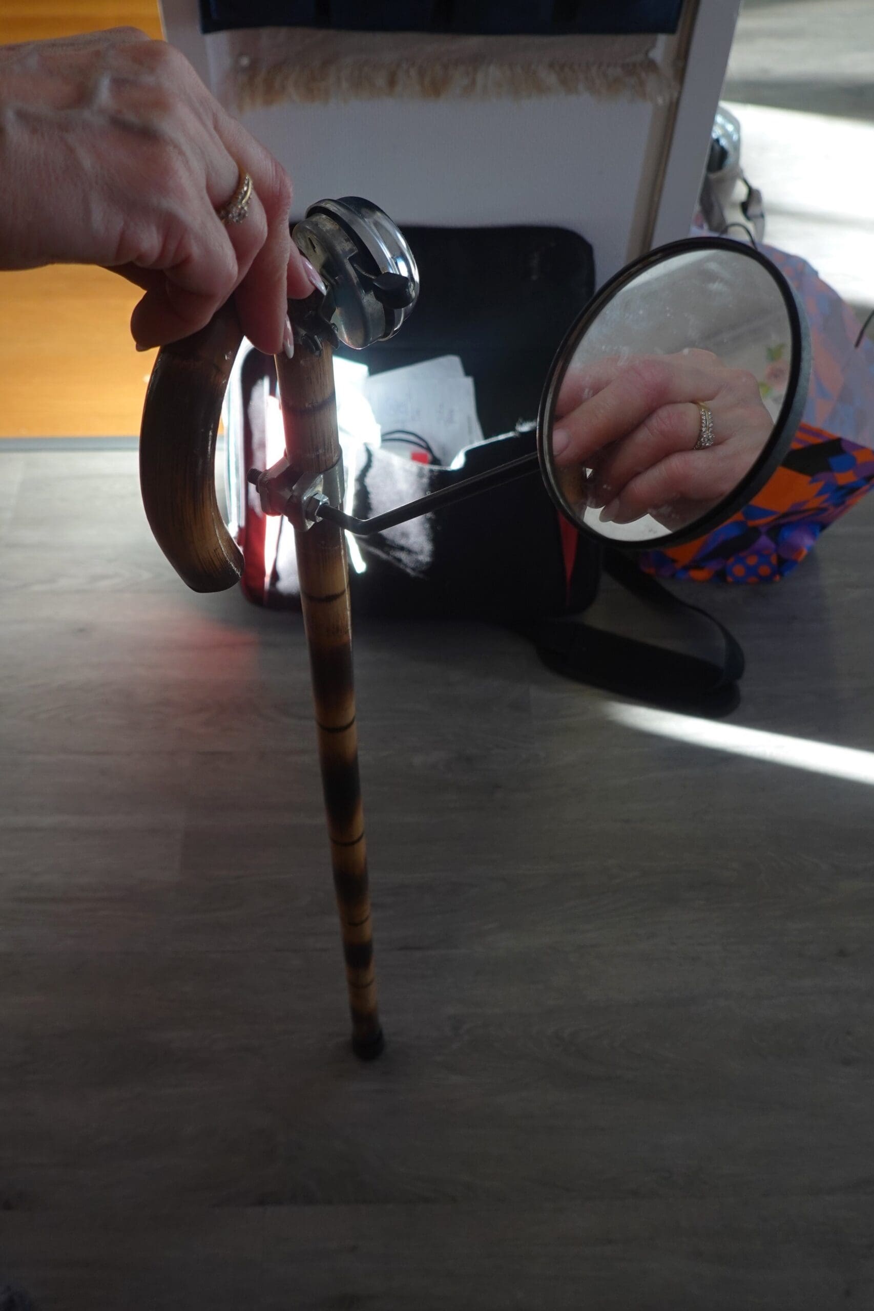 Till husets utrustning hörde även denna käpp. Kanske något man borde införskaffa när man blir lite skröpligare. Backspegeln förstår jag, men ringklockan? Kanske kommer man upp i sådan hastighet med käpp att man behöver varna sina medtrafikanter för sin framfart.