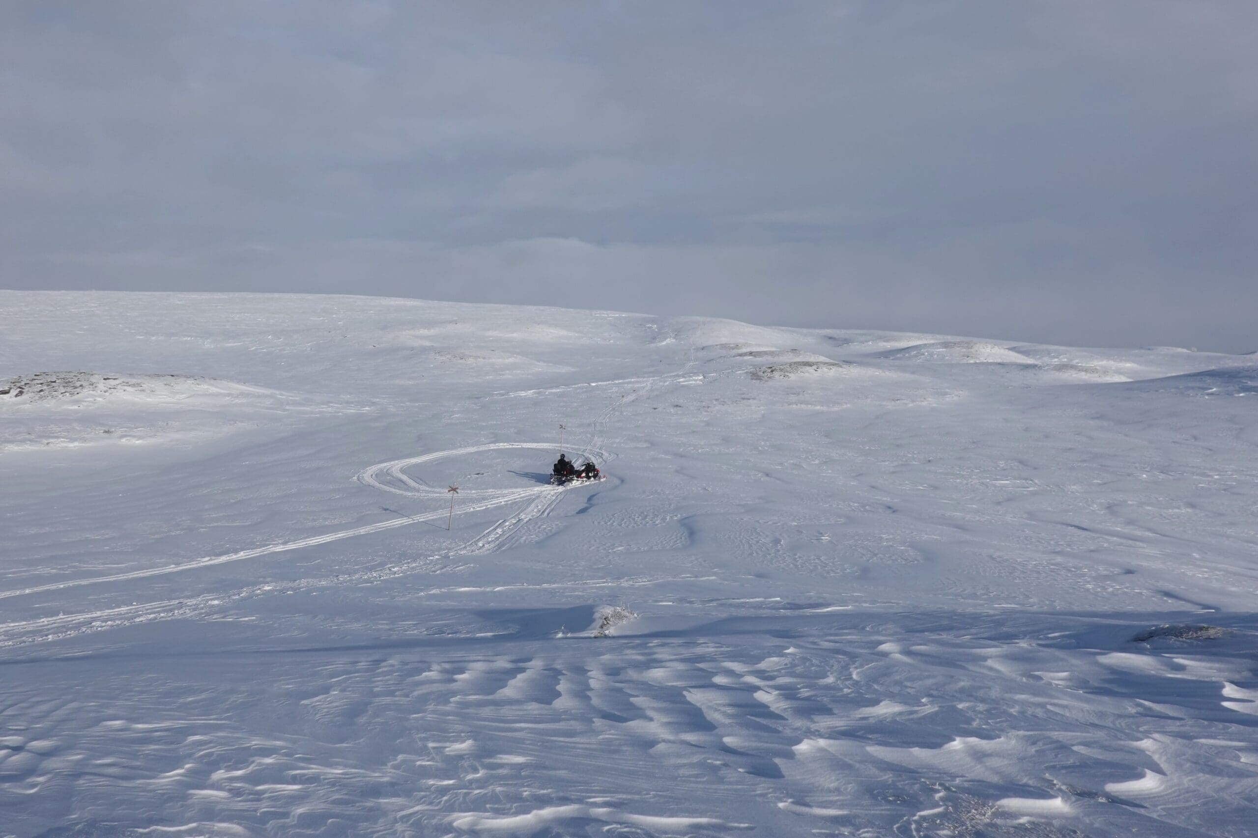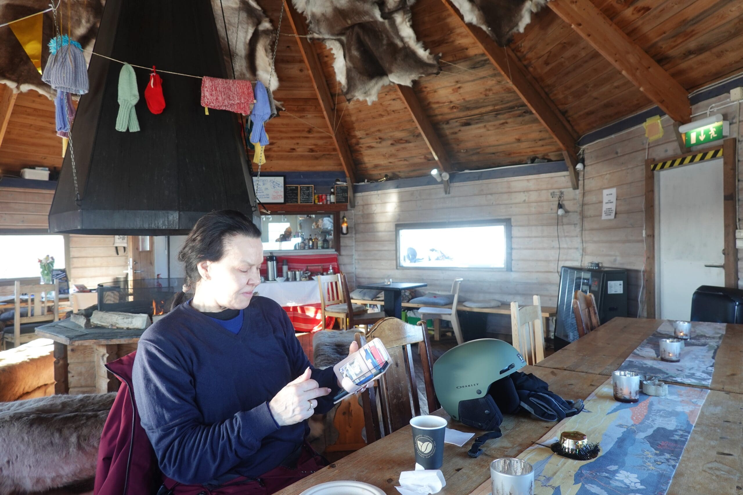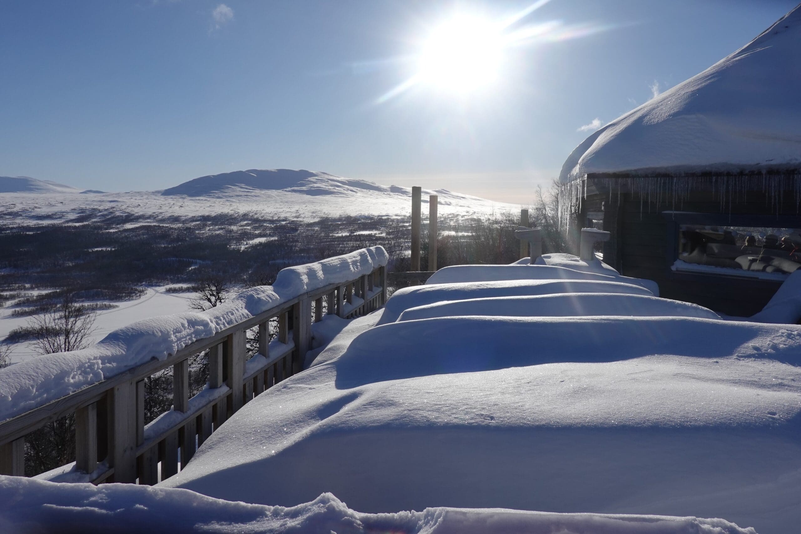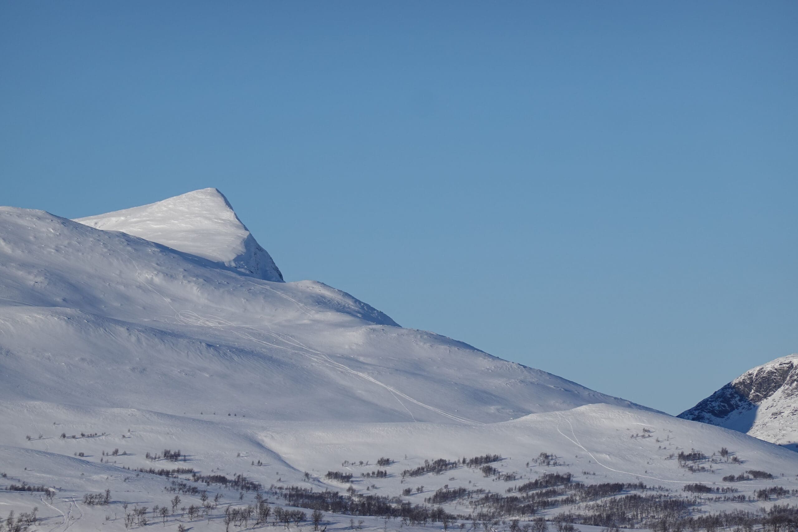 Och de här vackra topparna, vad kan de heta? Kan det vara de norra Borgafjällen? Vi pratade faktiskt om att göra en dagsutflykt till Borgafjäll, som erbjuder lite mer varierad utförsåkning, men det var nästan två timmars bilresa en väg, så det kändes som i längsta laget. Med skoter hade vi tydligen pipit över på en kafferast.