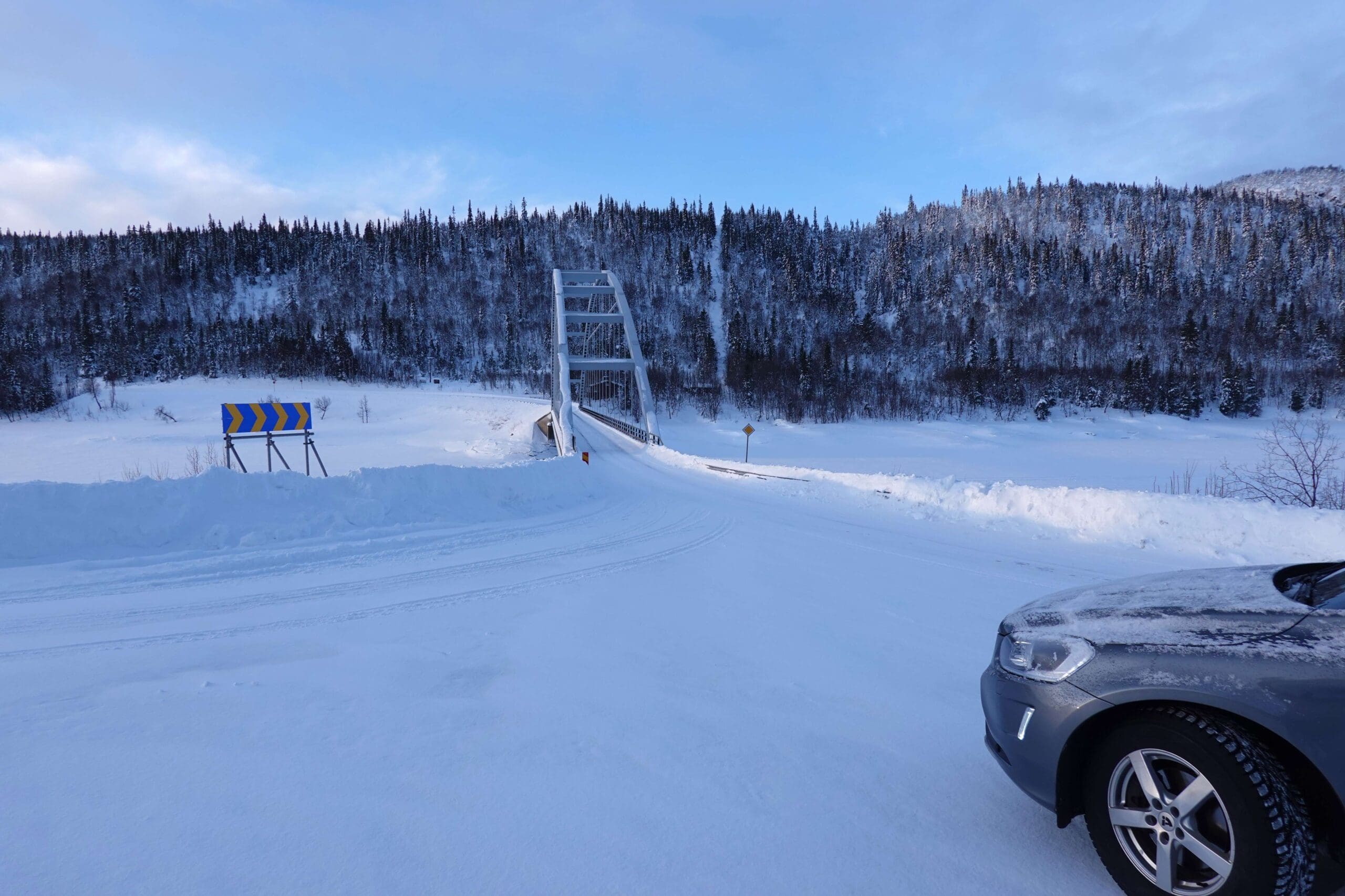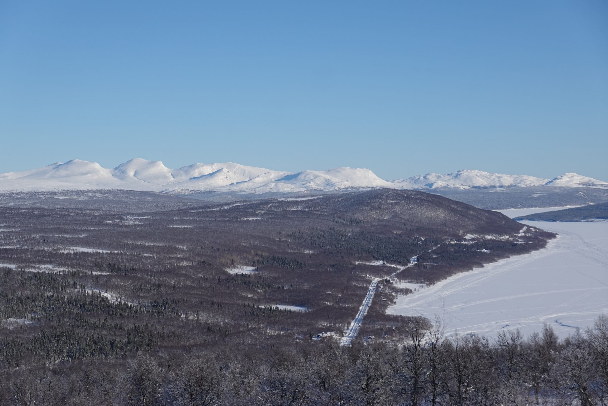 På vägen upp var det mörkt, men nu kunde man njuta av det fantastiska landskapet. Folk var ute på isen och fiskade och på en del ställen hade isen släppt (eller hade den aldrig lagt sig?) och vattnet forsade fram. Vi åkte förbi Ättestupan vars röda brant tydligen givit upphov till historier om ond, bråd död. Man åker igenom byn Saxnäs, en ort känd för nästan hundra år av vinterturism. Åt andra hållet, väster om Klimpfjäll är vägen bara öppen 6 juni – 15 oktober. Det lär ska vara en fantastisk upplevelse att köra direkt efter öppnandet, som i en kanal tömd på vatten omgiven av murar med snö. Man får väl hoppas att det bara gäller en del av sträckan så att man får njuta av utsikten också. Denna Sveriges högst belägna, asfalterade väg viker söderut vid Stekenjokk (strax innan gränsen mot Norge) och leder vidare mot Stora Blåsjön, Gäddede och Strömsund. Det är ju namn på platser som bara de får i alla fall min fantasi att gå igång.