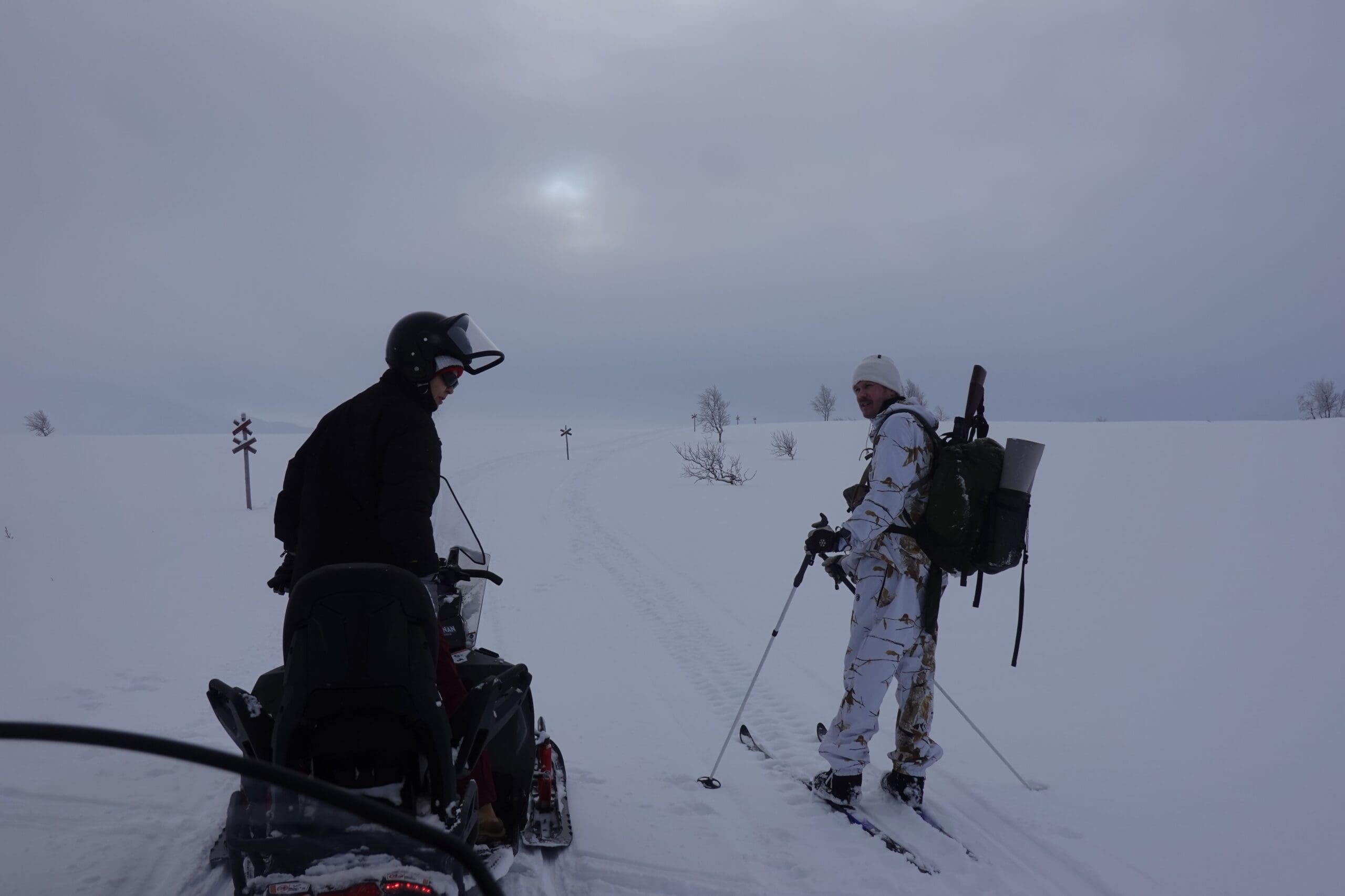 Fredag och ännu lite friskare. Mitt hälsotillstånd alltså, inte vädret. Förutom ett par dagar hade det faktiskt varit ganska milt på dagarna, bara några enstaka minusgrader. Idag skulle ett Pokerrun på skoter gå av stapeln. Det lät ju lite kul. Nu var det runt 35 år sedan jag körde snöskoter och den gången skedde det på en sjö i Hälsingland. Kört i riktig terräng hade jag aldrig gjort förut. För att jag skulle få öva lite innan start, drog vi upp på fjället och kom ikapp denne skidåkare. Han hade parkerat sin skoter en bit ner och skulle nu försöka skjuta en eller annan snöripa. Undrar hur det gick.
