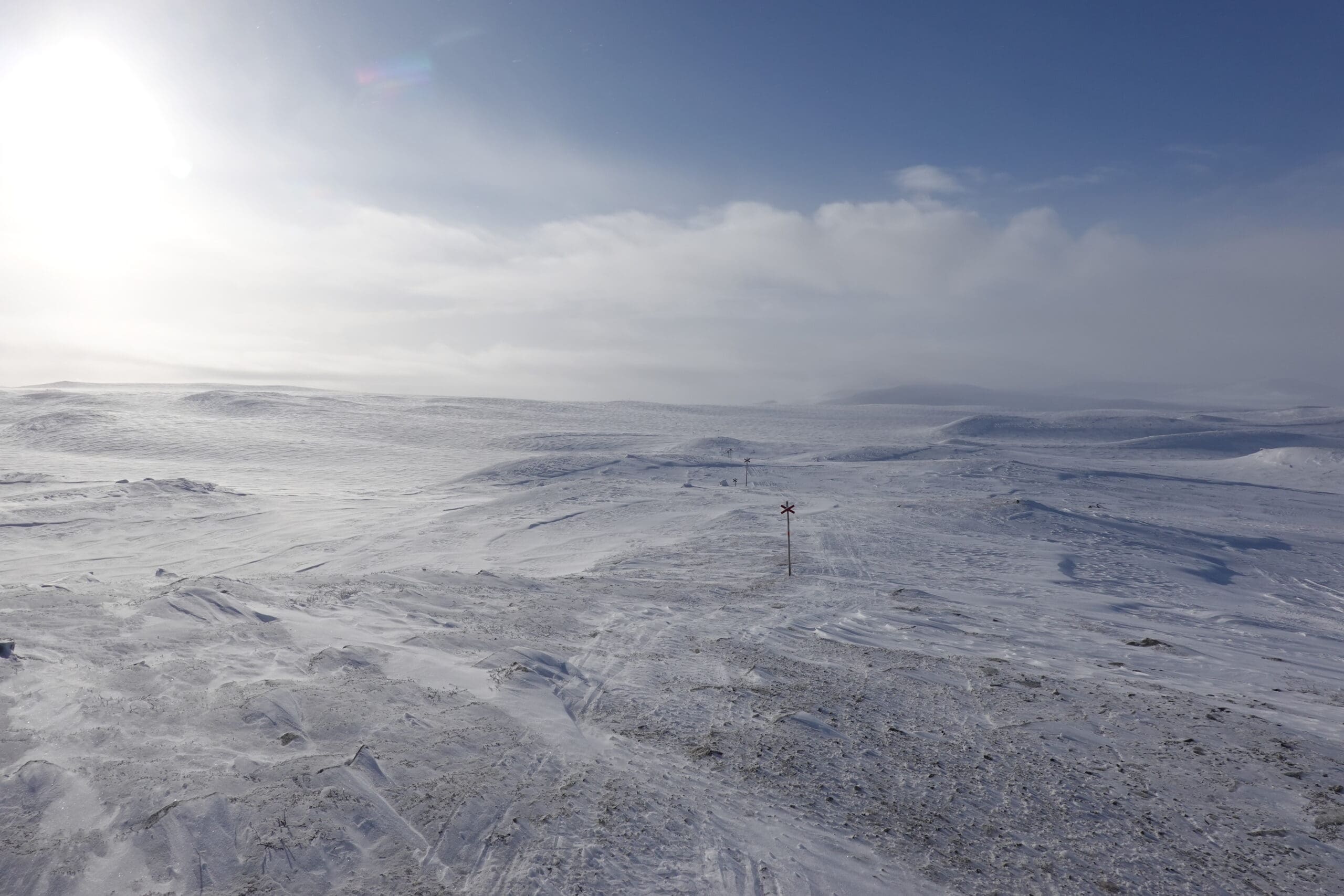 Egentligen hade vi skrinlagt planerna att köra upp på fjället, då vädret inte medgav någon längre sikt, men allt eftersom blev gluggarna i molntäcket allt fler och större och vi kom närmre och närmre Slipsikstugan, vilket var målet enligt den ursprungliga planen. Just här hade dock snön blåst bort. Vi hade möjligen kunnat köra utanför leden, men vi var inte riktigt utrustade för en sådan här tur och Liza ville inte chansa att ge sig utanför leden utan spade, för det fall vi skulle fastna. Sedan kom det en kille och körde runt kullen med den bortblåsta snön, så det hade säkert gått bra för oss också, men det var nog klokt att inte chansa.
