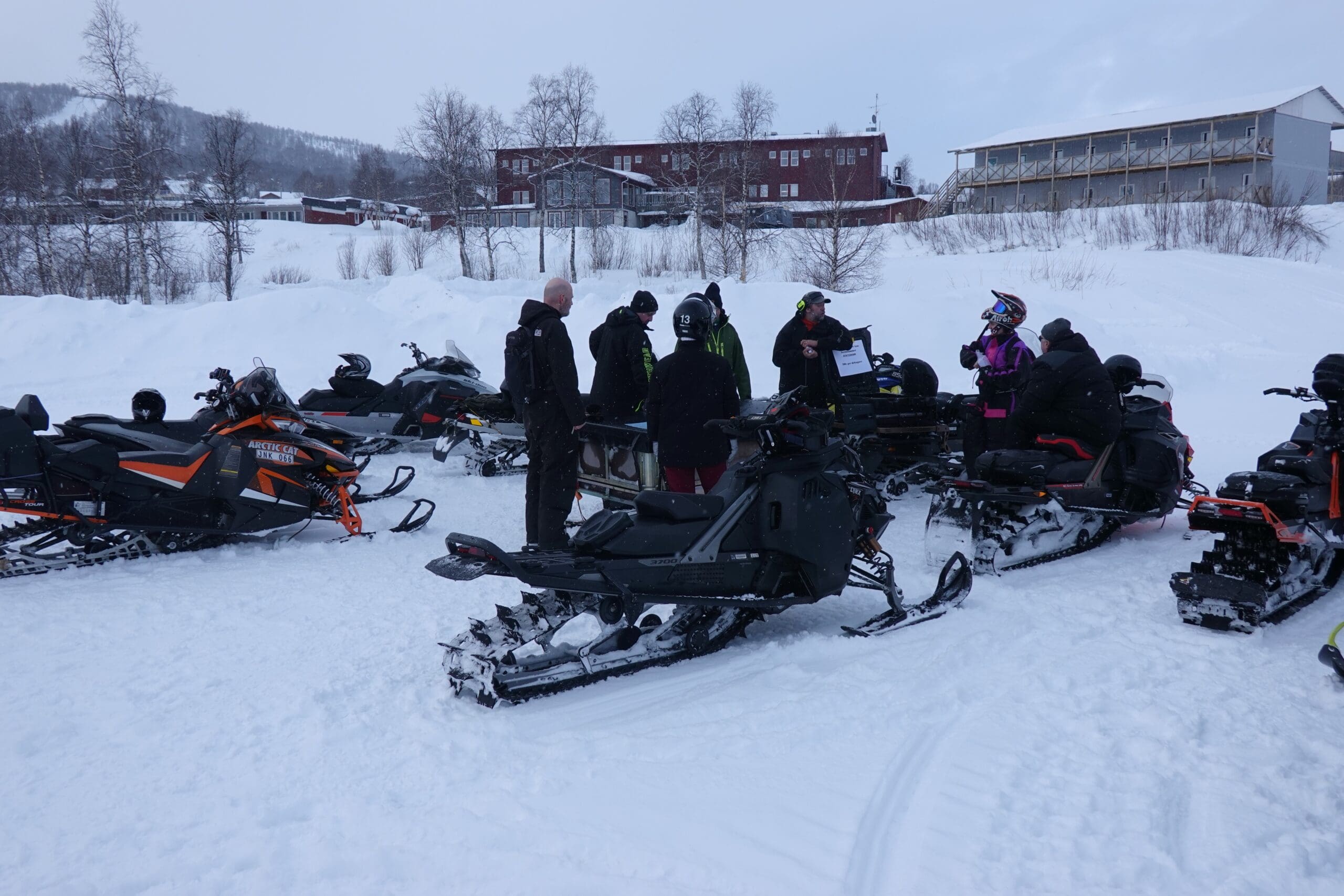 Vid ettiden samlades ca 25 skotrar på isen nedanför byns hotell för att förbereda sig för starten i Pokerrun.